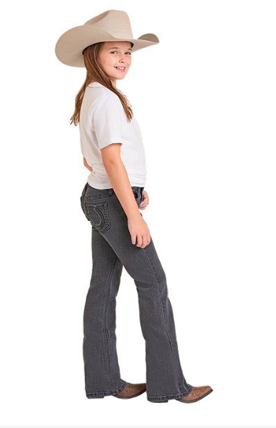 Just like the big cowgirls, these distressed black bootcut denim have a fun embroidered horseshoe on the back pocket.