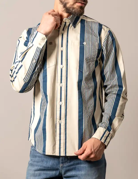 Twill long-sleeve shirt with an all-over stripe pattern, western yoke, double chest pockets with label detailing, and a hidden button-down collar.