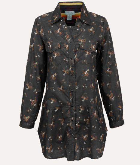 Quite possibly the most versatile piece in your closet - a fun retro western print in soft neutral tones, snaps all the way down with tiered bottom. Use her as a dress, tunic, duster or a shacket! Dress her up with a concho belt and boots for the perfect elevated Western look.