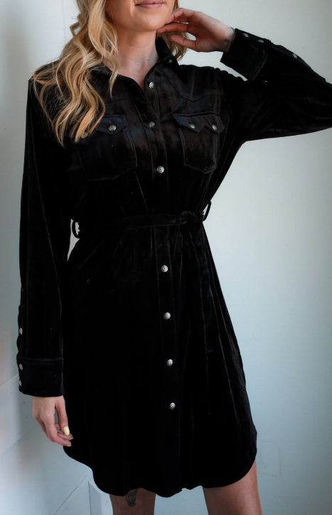 When the occasion calls for something special, Liza will fit the bill. Soft black velvet with the signature Tasha Polizzi concho buttons, self belt, two front pockets. Wear her as a dress or a duster - super versatile!