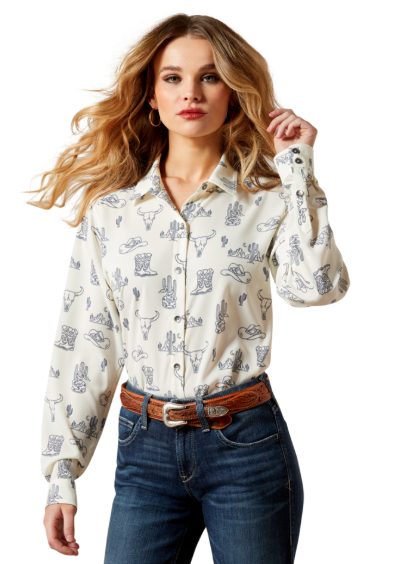 Soft cream and navy in a fun desert print make this shirt perfect to pair with denim.