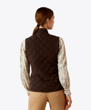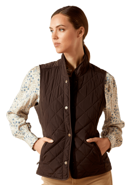 A stylish and cozy quilted vest in rich Coffee Bean chocolate - fun horse print lining ups the game.