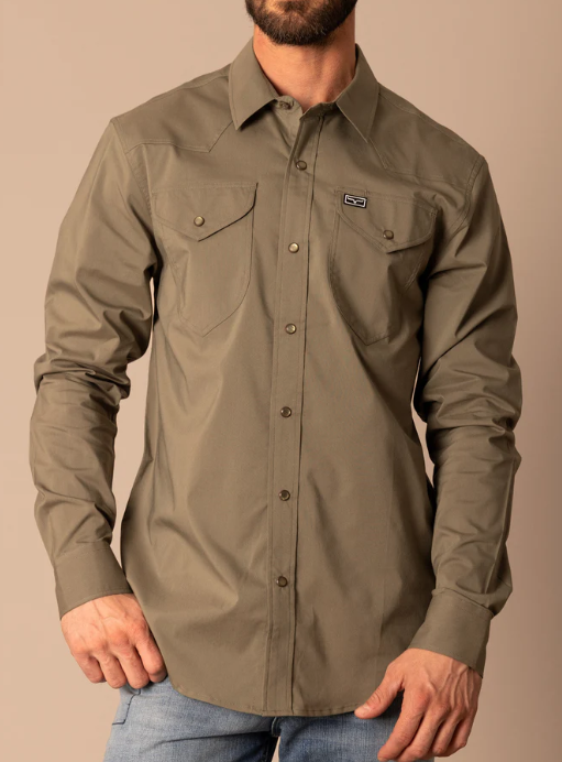 The Blackout features stretch-woven, moisture wicking Coolmax fabric. This piece is solid-colored and full of classic western details like matching pearl snap buttons down the front and closing the two chest pockets, a western yoke, and a collared neckline. The Blackout is the ultimate western work shirt.