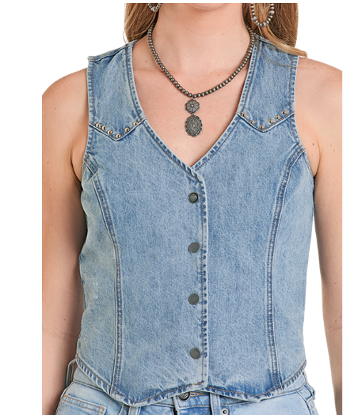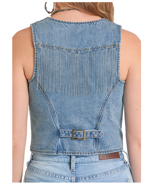 The denim vest you need - get a little western with this classic denim vest that has just the right amount of fringe on the back yoke. Flattering princess seams and adjustable buckle strap in the back.