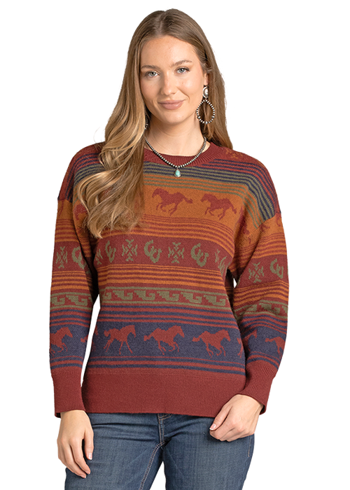 So comfy and so cute - this oversized crew neck sweater features a serape pattern with horses running across the chest area. Fall tones of rust, camel and navy pair perfectly with denim.